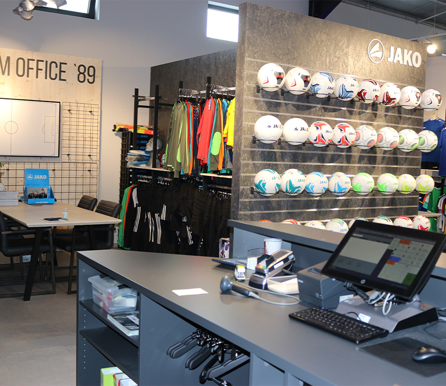 Modern team sports experience worldWelcome your customers in the future to a modern team sports experience world. Here, you present the JAKO collection with state-of-the-art modules and impress with your specialist service – expertise, personal support, and customization. With TEAMSHOP89, you skillfully combine the advantages of both in-store and digital solutions for your team sports business.